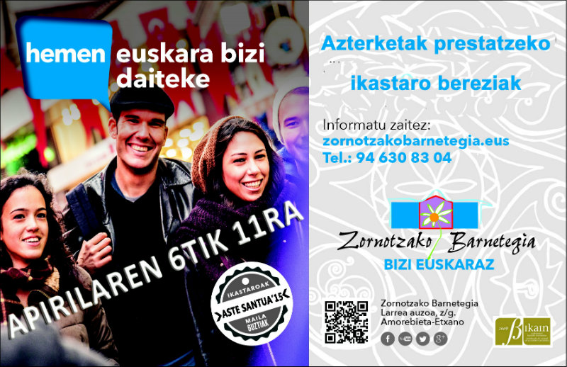 Dagoeneko, hasi da entzuten hainbat eta hainbat gustatzen zaigun esaldi hori: “LASTER OPORRAK!”. Bada, ez da gure kasua! Zornotzako Barnetegian, iaz izandako arrakasta kontuan harturik eta, aurten ere, zuok horrela eskatuta, errepikatuko dugu aurreko Aste Santuko esperientzia; hau da, gurean MAILA GUZTIAK prestatzeko IKASTARO TRINKOAK eskainiko dizkizuegu. Beraz, HABE azterketak edota OPEren bat prestatzeko asmoa baduzue, hauxe da azken bultzada emateko proposatzen dizuegun plana: apirilaren 6tik 11ra (biak barne), euskara bizitzea; baita euskaraz bizitzea ere.