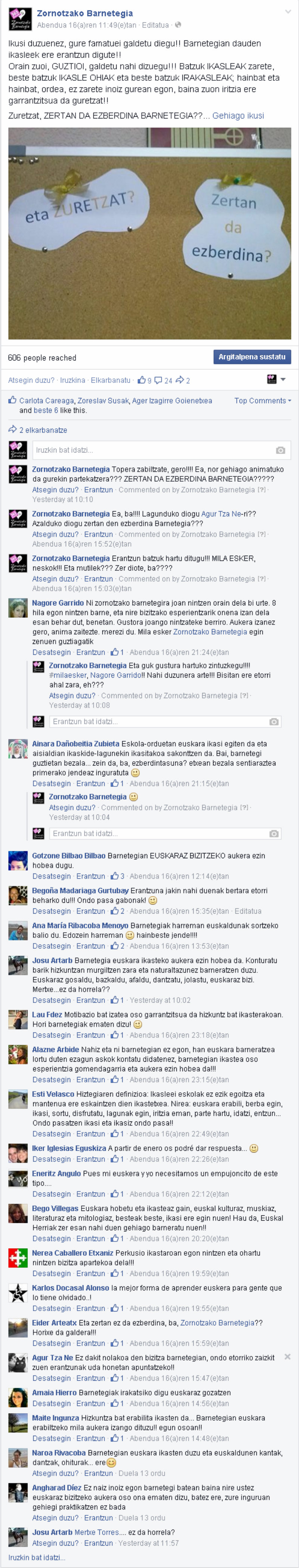 Beste aldetik, facebook-eko jarraitzaileei ere luzatu diegu galdera, eta erantzun batzuk hartu ditugu bide horretatik ere. Ikasle ohiak, irakasleak, laster etorriko direnak eta Barnetegiaren lagunak topatu ditugu, besteak beste, erantzuleen artean; eta asko gustatu zaigu zuen berri jasotzea. Hona hemen iruzkinak: