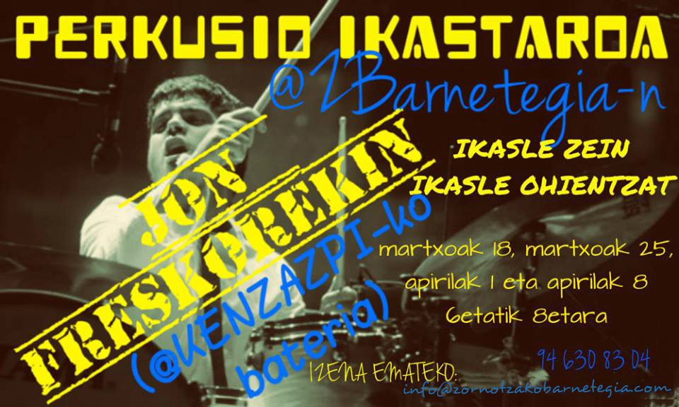 Datorren astean hasita, lau asteko perkusio ikastaroa izango dugu Zornotzako Barnetegian Jon Freskoren (Ken Zazpi) eskutik. Ikastaroa 8 ordukoa izango da, eta horrela antolatu dugu: martxoak 18, martxoak 25, apirilak 1 eta apirilak 8, arratsaldeko 6etatik 8etara.