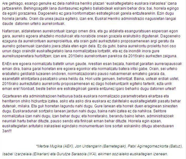 Hala ere, batzuok pentsatuko duzue HABEk orain 6 urteko egoerari eustea nahikoa dela, eta horrela litzateke abiapuntua, hau da, orain 6 urteko egoera eta orduko diru-laguntzak onargarriak izan balira; bestela esanda, orain dela 6 urteko euskaltegion egoera normalizatua izan balitz. Zoritxarrez, ez zen horrela izan.