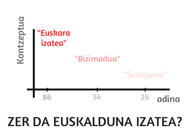 • Alaba, 26 urteko neskatoa, erdi harrituta geratu zen galdera entzutean; erdi mutuan. “Ez dakit”-ka ere ibili zen tarte batzuetan. Eta hainbeste pentsatu ondoren, hauxe esan zuen: "Euskalduna izatea barruan sentitu ahal den zera bat da".